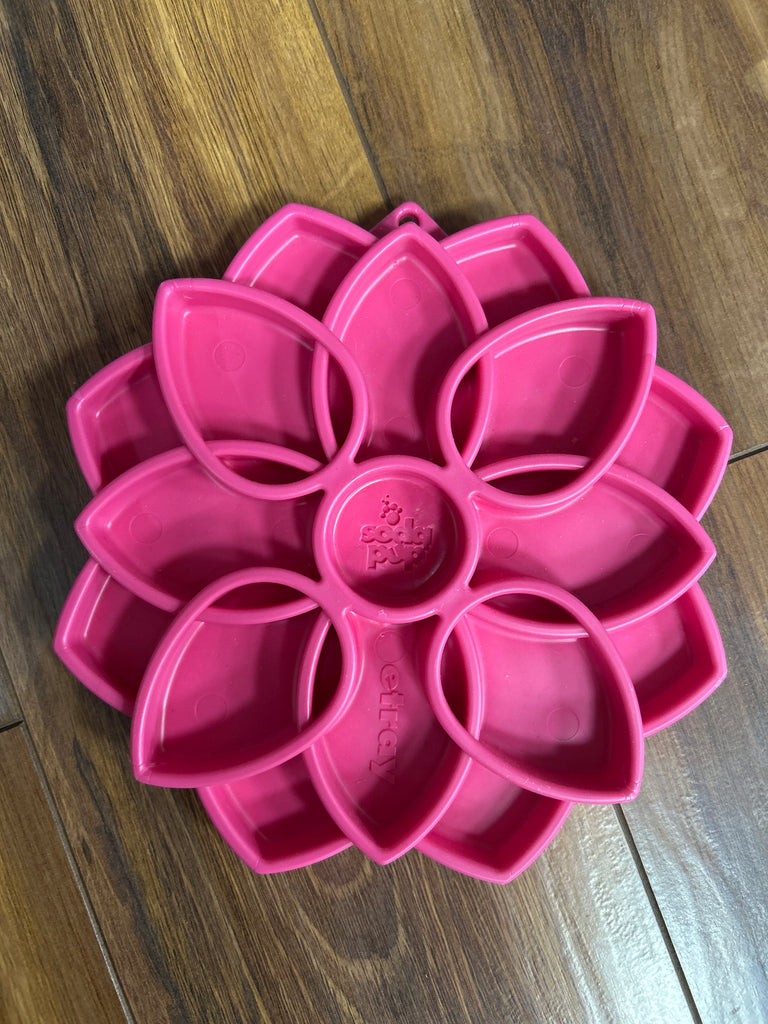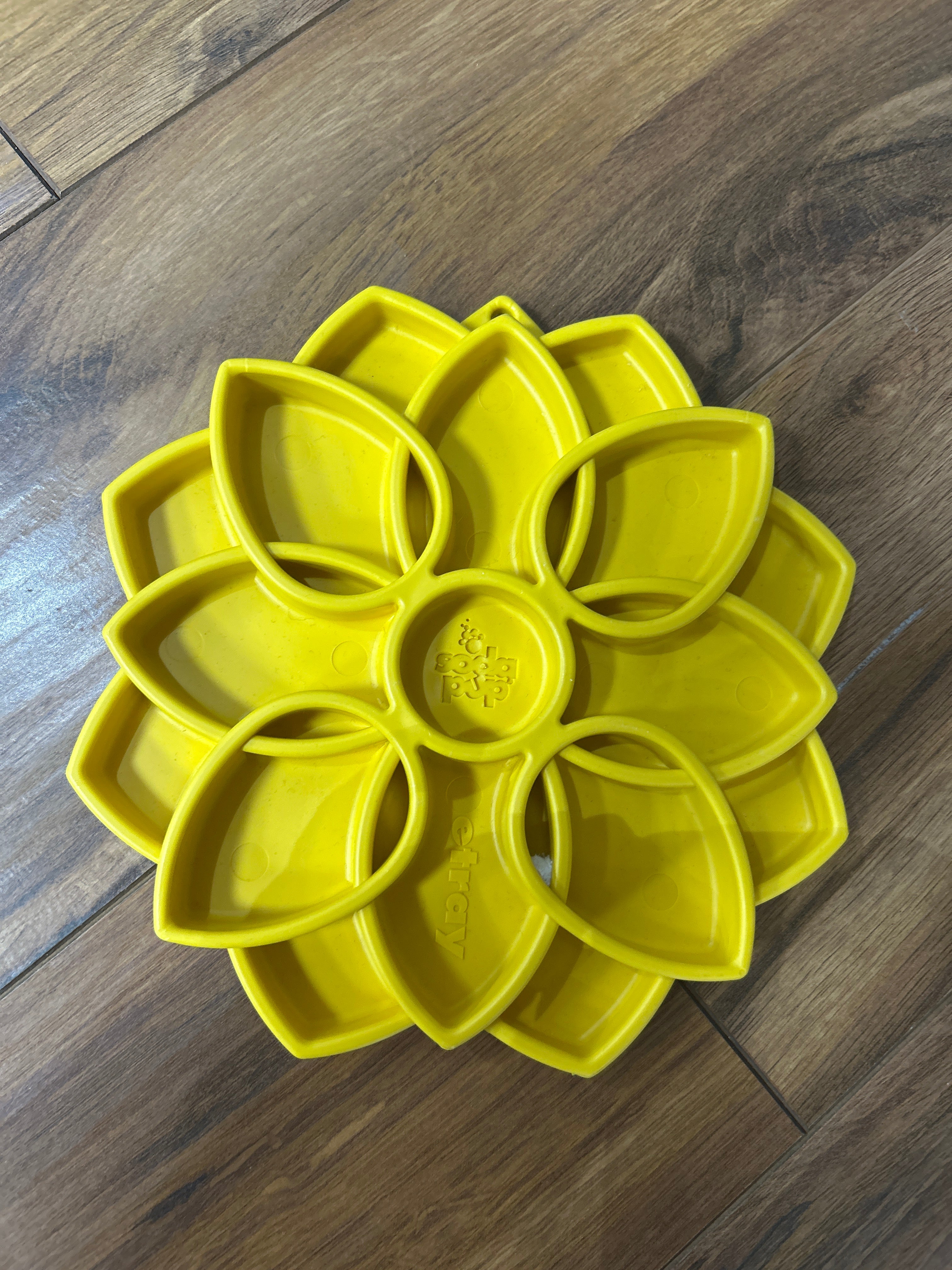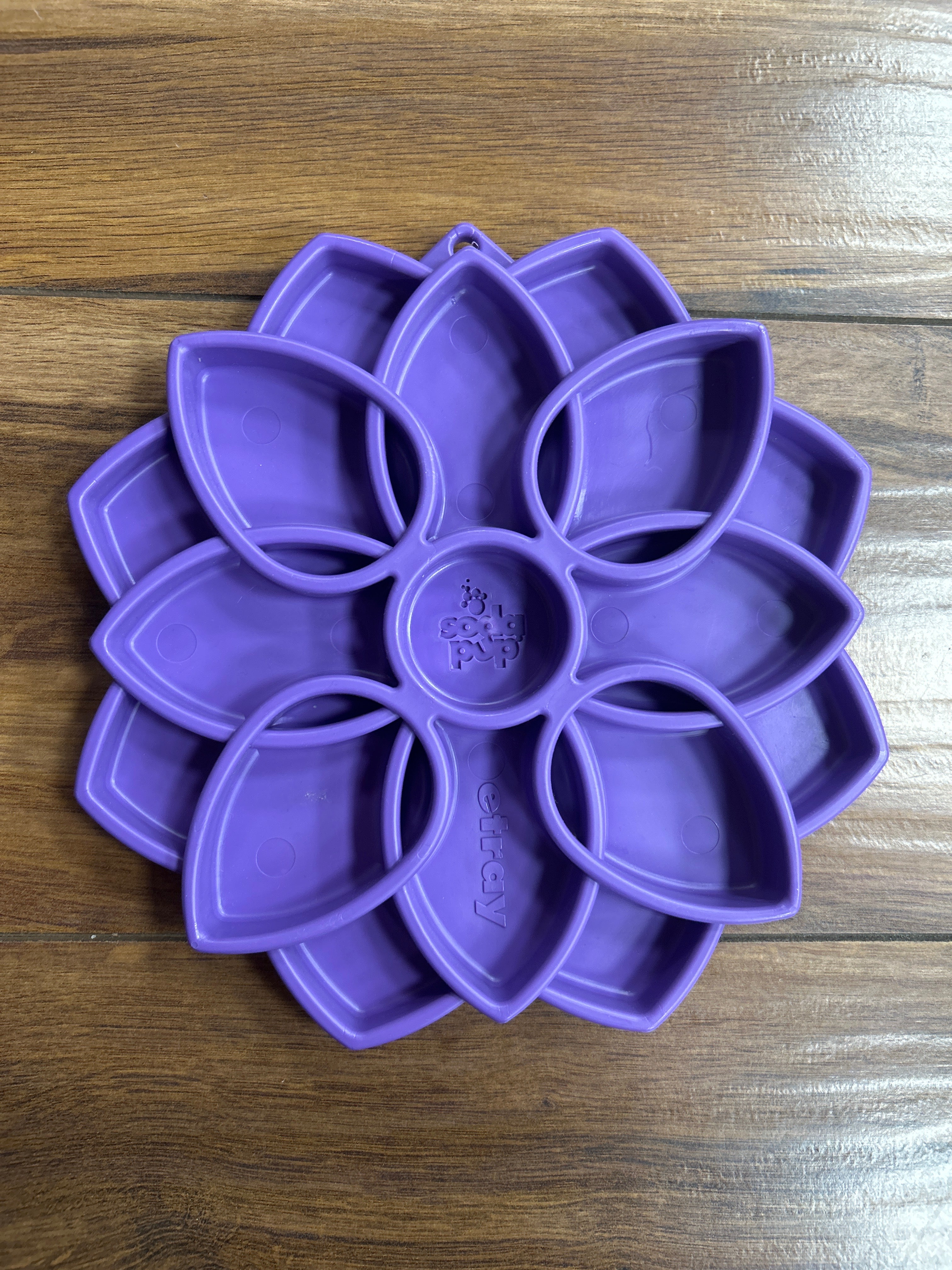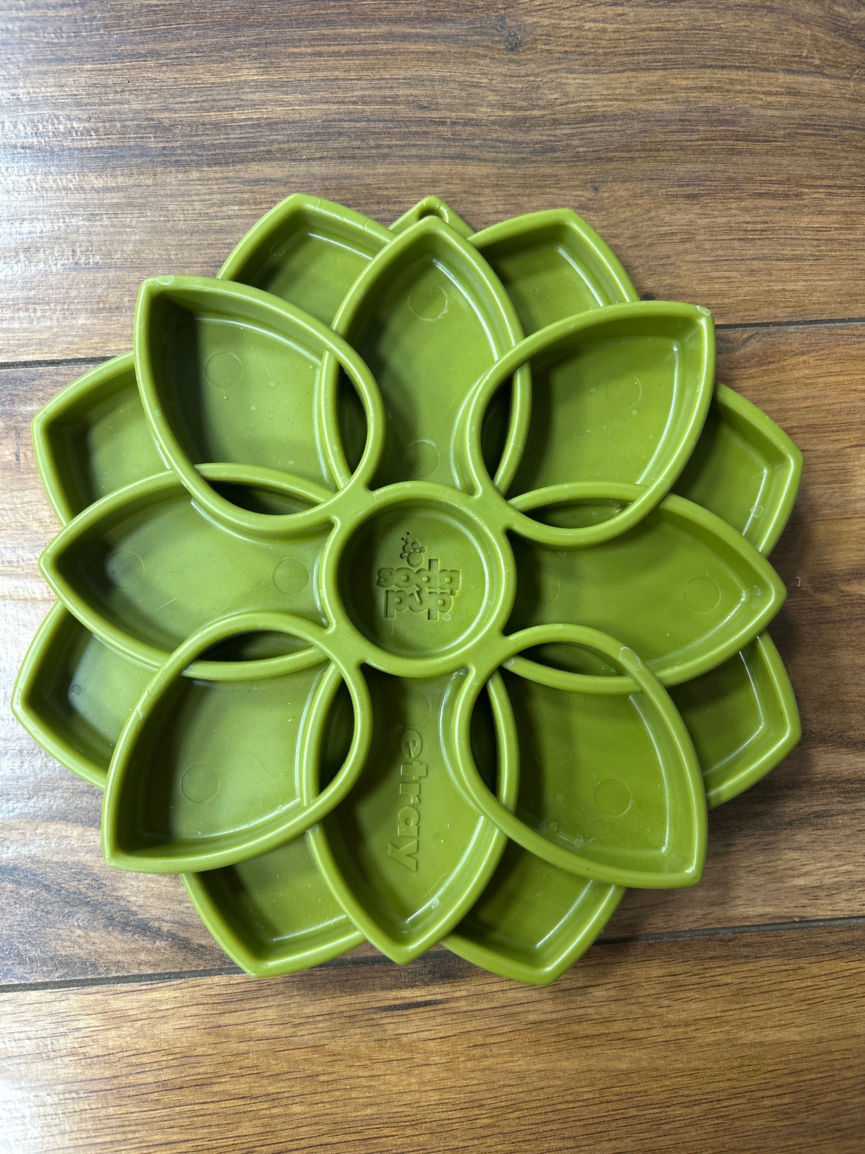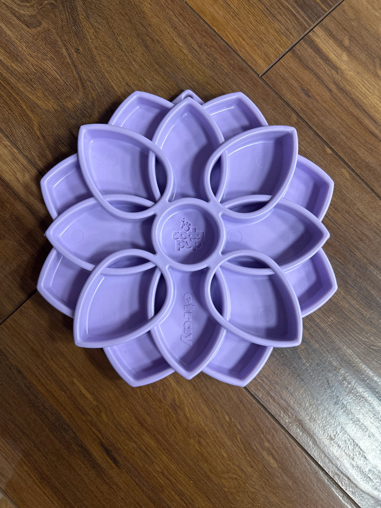 Meditate upon a better enrichment journey for you and your dog. The Mandala etray promotes healthy slower eating, giving you peace of mind and giving your dog a peaceful belly. The Mandala etray marries the benefits of lick mats with the benefits of slow feeder bowls. Om..... ENRICHMENT: The Mandala etray promotes slower eating and improves digestions. Perfect for all size dogs including puppies. BENEFITS The Mandala is perfect for serving wet and dry foods together without making a mess. You can combine foods together or separate them in the individual chambers of the design. The depth of the Mandala is ideal for serving raw meals (consult veterinarian). The Mandala can be used for snacks or for meals. The Mandala design features different heights and depths imitating more natural eating conditions and putting your dogs natural foraging instincts to the test. Ideal for flat nosed dogs like bully breeds that may struggle with deeper slow feeder bowls. The Mandala design i