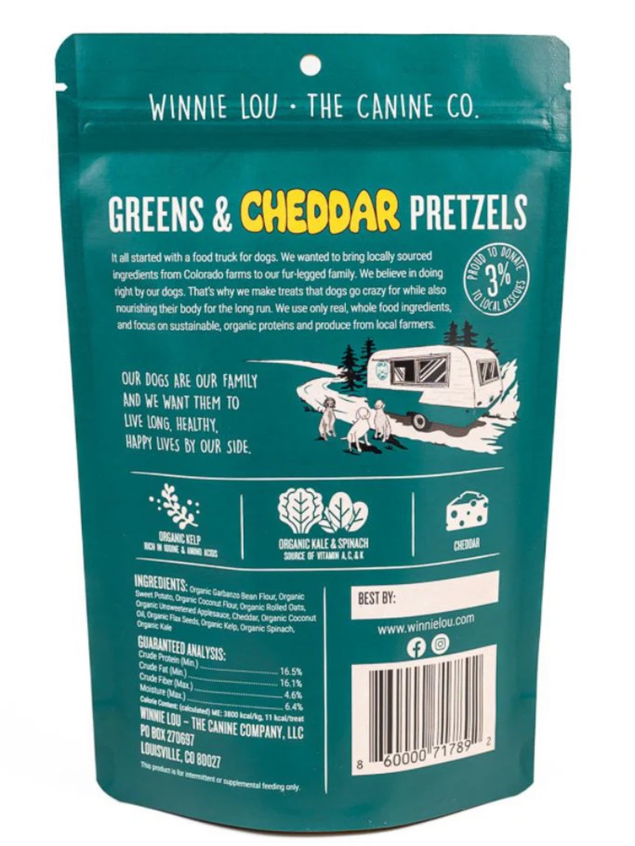 Greens & Cheddar Pretzels are the perfect treat or meal topper to give your pup a boost of Vitamins and Amino Acids with every meal! Crafter with Cheddar, Colorado Applesauce and loads of greens. Spinach & Kale for Vitamins A & K. And organic Kelp which is rich in iodine, minerals, & amino acids.