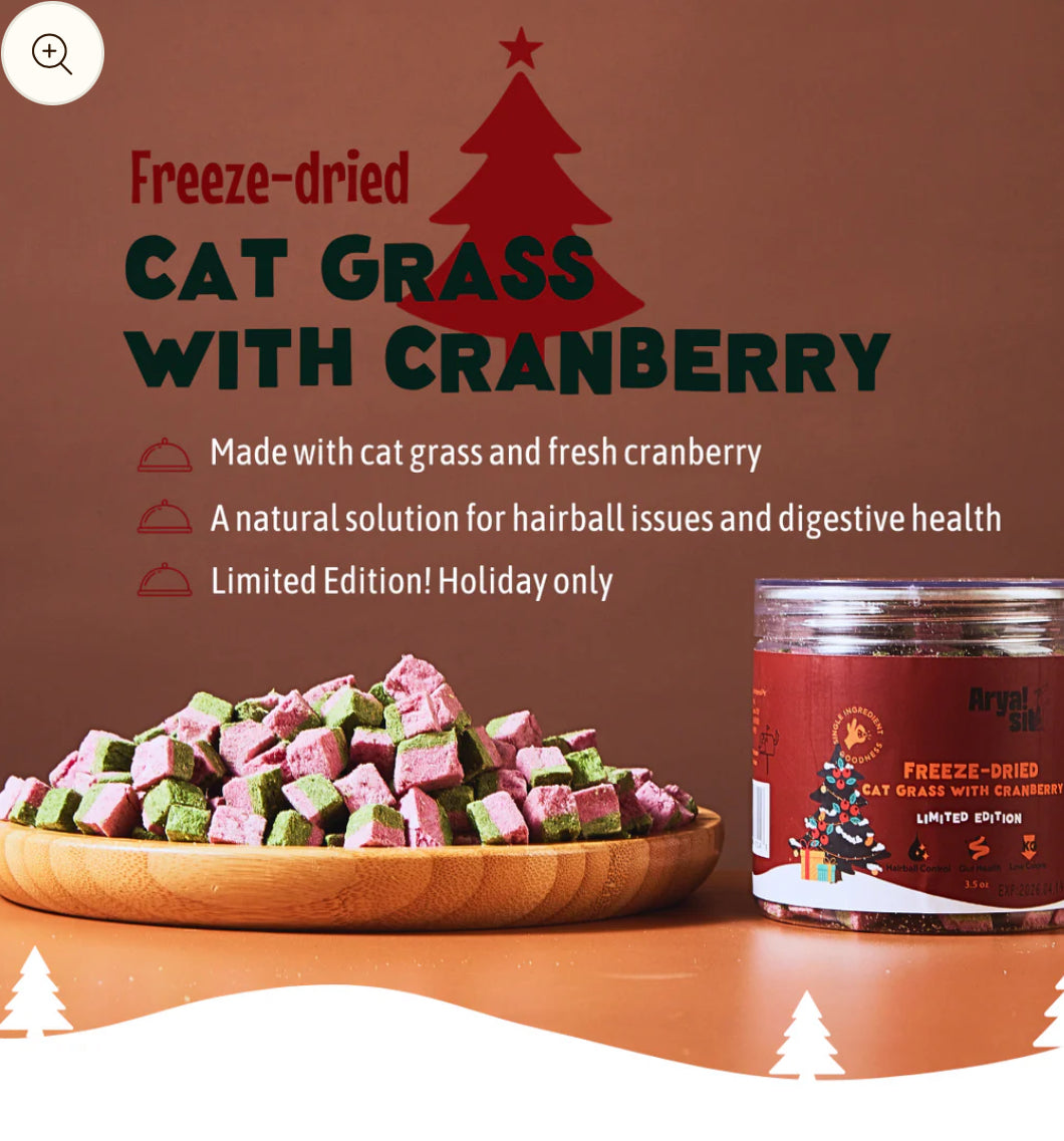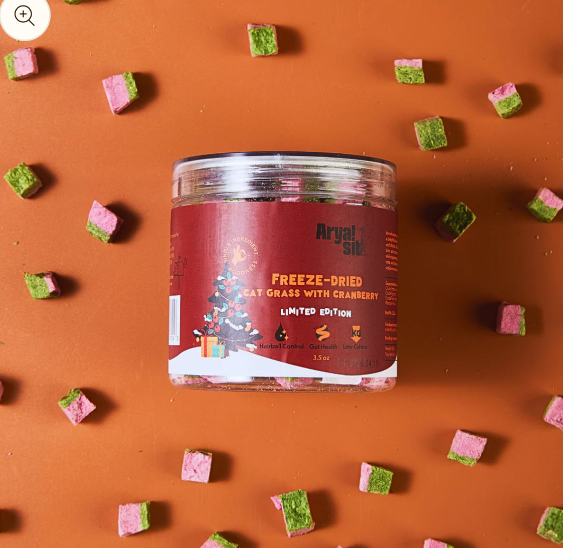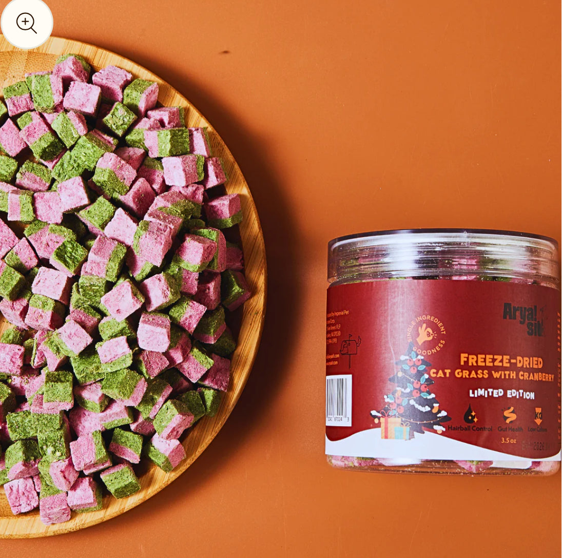 AryaSit! Holiday Limited Edition Treat - a delightful blend of freezed-dried cat grass, cranberry, and chicken breast. These bite-sized chews offer an irresistible taste and provide a natural solution for hairball control while supporting your pets' digestive health. Contains no artificial flavors, sweeteners or preservatives.