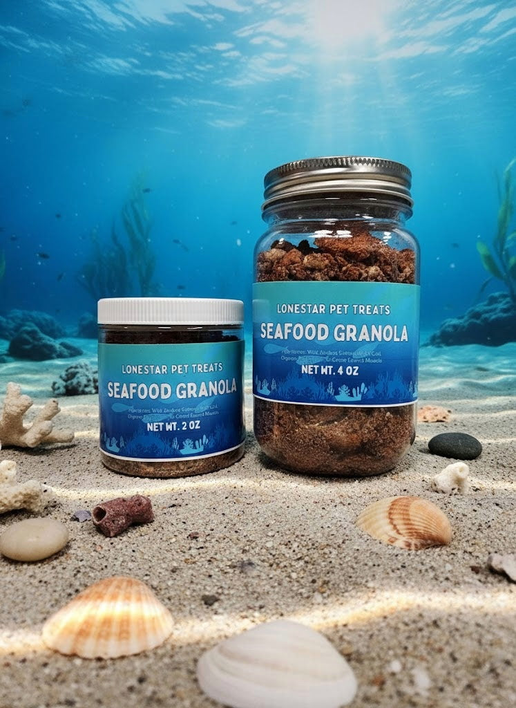 Simply sprinkle Seafood Granola over your pet’s regular food to boost flavor and nutrition. Perfect for picky eaters or pets who deserve a little extra love at mealtime.